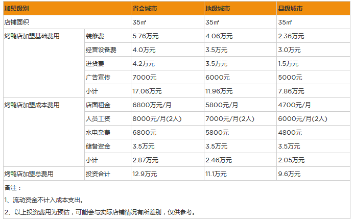 縣級城市加盟烤鴨店需要投資:9.4萬元,預估年凈利潤:20.37萬元。