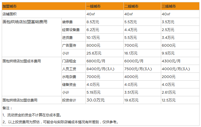 一般來說,面包、蛋糕的銷售凈利潤在20%~40%,中等消費城市(城鎮或農村)單店平均每天的銷售額都在300~500元以上,高峰期每天的銷售額可達1500~3000元以上,一年內即可收回全部投資。中上等消費城市(城鎮或農村)單店平均每天的銷售額都在500~1500元以上,高峰期每天的銷售額可達3000~5000元以上,半年內即可收回全部投資。