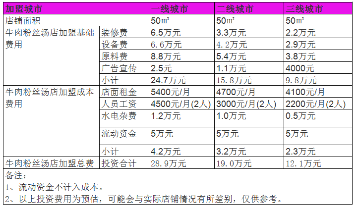 牛肉粉絲湯店的加盟店一般需要50平方米的營業面積,在二三線城市,這樣的店面租金費用在每個月8000元左右,裝修費用700元一平米,50平米就是4.9萬元,另外設備需要費用4萬元,前期材料費用3萬元,一季度工資3000元每月一個人,準備流動資金4萬元。
