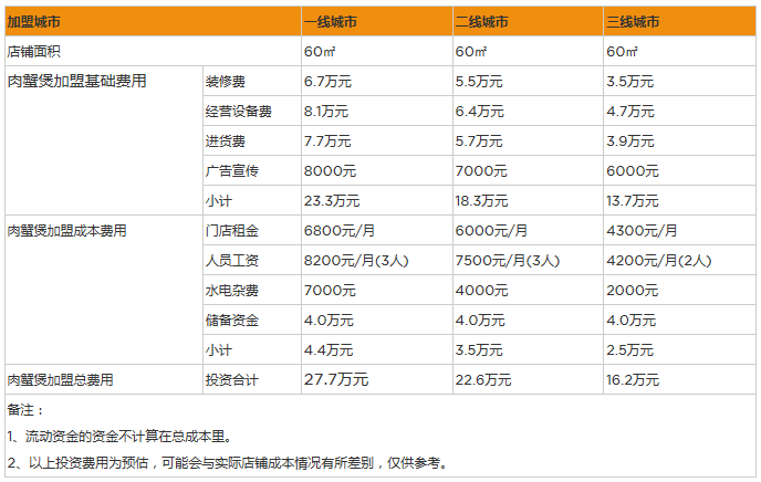 開家肉蟹煲投資一般需要多少錢?60㎡投資16萬,詳情數據分析