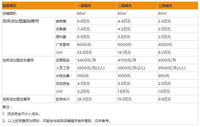 標(biāo)準(zhǔn)店加盟:店鋪面積60㎡,人均消費(fèi)20元,日客流量130人,日營(yíng)業(yè)額2600元,月?tīng)I(yíng)業(yè)額7.8萬(wàn)元,毛利率70%,毛利潤(rùn)(月)5.46萬(wàn)元,店面租金4900元/月(6.5元/天/㎡),水電雜費(fèi)1100元,人員工資6000元/月(3000元/月/人*2人),凈利潤(rùn)(月)4.26萬(wàn)元,凈利潤(rùn)(年)51.15萬(wàn)元。