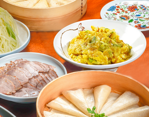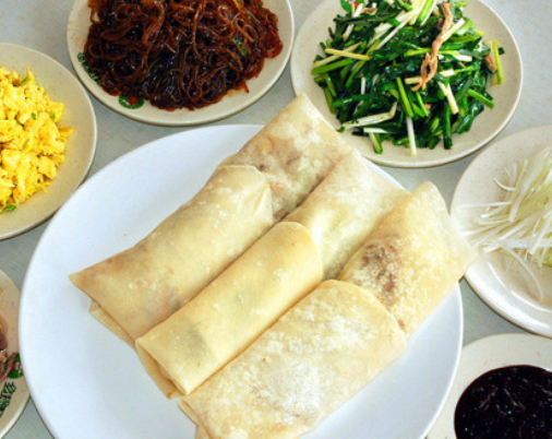 4、春餅北京民俗食品,一種烙得很薄的面餅,又稱薄餅。每年立春日,北京人都要吃春餅,名曰“咬春”。農歷二月初二,是中國古諺所說龍抬頭的日子(“二月二,龍抬頭”),這一天北京人也要吃春餅,名曰“吃龍鱗”。春餅比吃烤鴨的薄餅要大,并且有韌性(北京人稱為要有“骨立勁兒”),因為要卷很多菜吃。昔日,吃春餅時講究到盒子鋪去叫“蘇盤”(又稱盒子菜)。盒子鋪就是醬肉鋪,店家派人送菜到家。盒子里分格碼放熏大肚、松仁小肚、爐肉(一種掛爐烤豬肉)、清醬肉、熏肘子、醬肘子、醬口條、熏雞、醬鴨等,吃時需改刀切成細絲,另配幾種家常炒菜(通常為肉絲炒韭芽、肉絲炒菠菜、醋烹綠豆芽、素炒粉絲,攤雞蛋等,若有剛上市的“野雞脖韭菜”炒瘦肉絲,再配以攤雞蛋,更是鮮香爽口),一起卷進春餅里吃。佐料有細蔥絲和淋上香油的黃醬(烤鴨配甜面醬)。吃春餅時,全家圍坐一起,把烙好的春餅放在蒸鍋里,隨吃隨拿,為的是吃個熱乎勁兒。若在二月二這一天吃春餅,北京人還講究把出嫁的姑娘接回家。