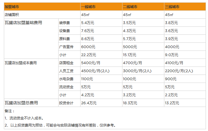 瓦罐店的投資經(jīng)營,其中還包含了人工的雇傭費(fèi)與保證金,將其與上述費(fèi)用一同計(jì)算,該品牌店在直轄市投資費(fèi)用為24萬,地級城市為17萬,縣級城市為13萬。