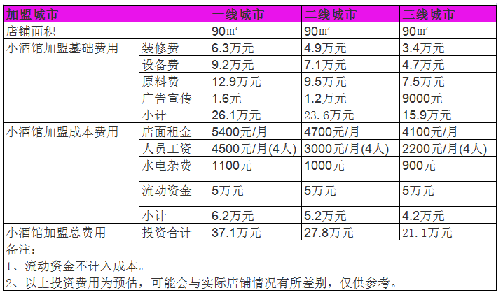 假設在一家地級城市開設一家小酒館的話,需要有充足的酒產品,桌椅板房等擺放空間,加盟商需要準備一個90平方米大小的店鋪,按照地級城市的房價計算,每月需要支付1.67萬元的房租費用,酒館的裝修需要符合其經營理念和營造良好的氛圍,門店需要進行精致的裝修,大約需要花費4.5萬元。