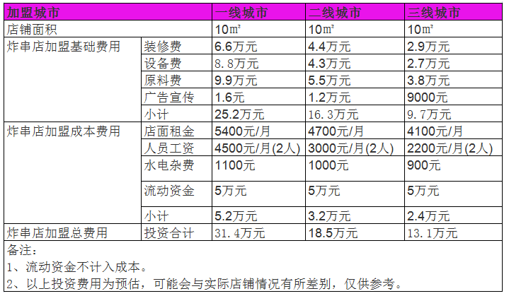 開家炸串店投資一般需要多少錢?10㎡店鋪啟動(dòng)資金13萬(wàn)