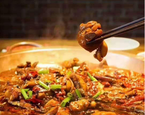 冒著火星的炭火銅鍋端上來,色澤鮮亮紅潤,夠味的辣椒、飽滿的花椒,掩映著麻辣入味的雞塊兒,看上一眼就讓人食欲大開,讓人口水大動,迫不及待地舉起筷子!