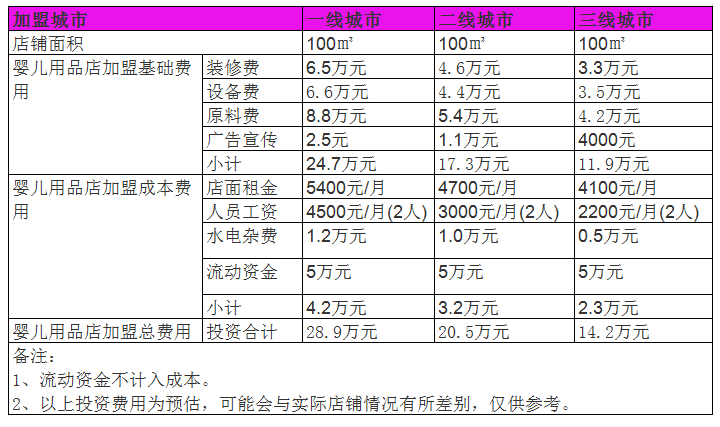 100㎡的嬰兒用品店成本在14萬元左右。開母嬰用品店成本及母嬰店利潤根據各地域實際情況和店面大小肯定會有所差別,投資者可參考數據結合當地市場情況進行分析。