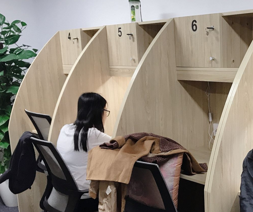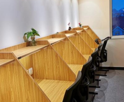 大部分自習室分為兩種:共享大廳與暗光格子間。共享大廳與前臺相連,是顧客一進門就能看到的地方,或者是靠窗風景比較好的地方,裝修較為文藝小清新。很多自由職業者會喜歡這樣氛圍來作為聯合辦公場所。而小隔間基本只有座位、臺燈、卷簾與儲物柜,好一點的格子間還會放置一些IPAD、耳機等電子設備,以供用戶進行線上學習。室內除擺放一些綠蘿和香薰之外,并沒有太多額外裝飾。